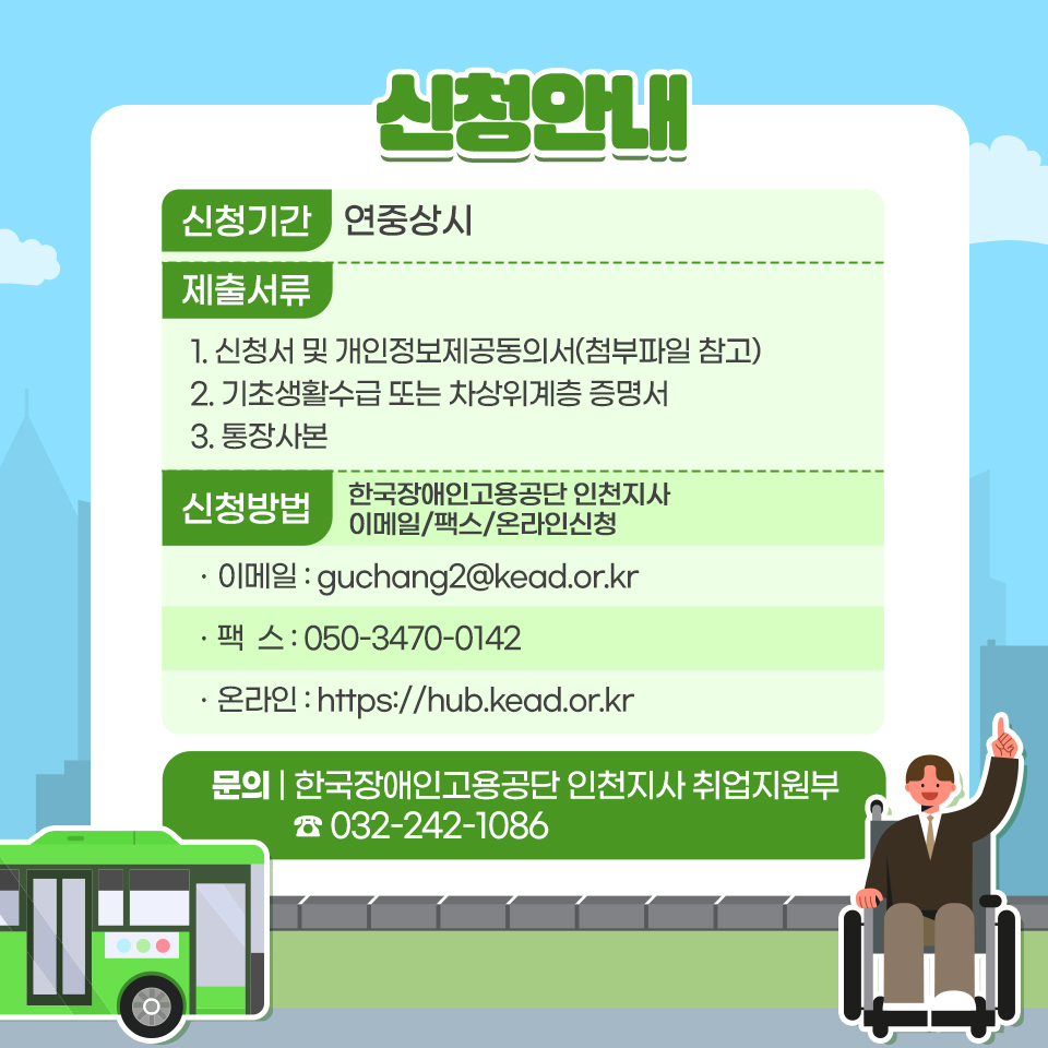 신청장소 : 한국장애인고용공단 인천지사(이메일/팩스/온라인신청 가능)