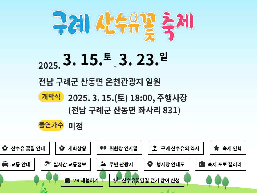 🎉 개막식: 2025년 3월 15일(토) 18:00, 주행사장 (구례군 산동면 좌사리 831)
