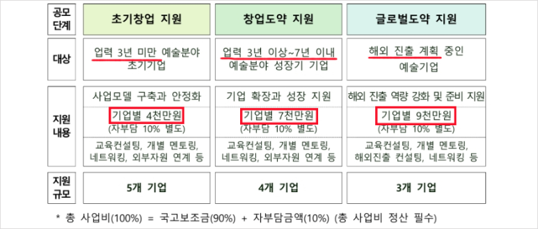- (지원목적) 예술분야 창업기업의 성장 단계별 체계적 지원 통한 자생력 제고